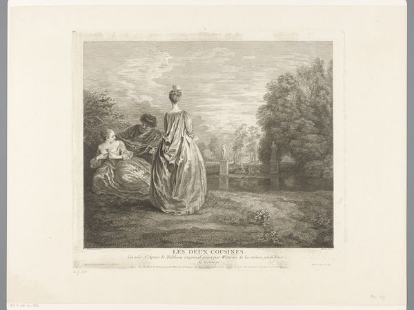Curator: This is Jean-Baptiste Madou's "Landscape with Standing Man and a Young Woman on a Bench," created in 1834. It's an engraving on paper, and something about the formality of the figures within that lush, almost overgrown, landscape strikes me. What do you think? Editor: The landscape feels very Romantic, almost staged. What do you see in this piece? Curator: The choice of engraving is fascinating here. Mass-produced prints democratized imagery, making art accessible beyond the elite. So, we must consider the economic underpinnings. Who was consuming these images, and what kind of social commentary were they looking for? The clothing itself speaks of a very distinct, probably wealthy, social class that consumed the engraving for enjoyment. Do you think that the technique and style are challenging the art industry of that time? Editor: Absolutely. It seems to blur lines between high art and something more readily available. How would that have been received then? Curator: This image presents a fascinating interplay of labor and leisure. The engraving process itself involved skilled labor, translated to leisure through its consumption by a certain segment of the public. Its popularity likely spurred further demand and the economic development of that industry and availability of paper. Can you imagine the environmental impact the demand of paper would have generated with such production? Editor: Wow, thinking about the art in terms of labour, consumption, and its material impact provides a new lens to understand its cultural value! I had never thought of engravings in this way before. Curator: Exactly. By considering the materiality and modes of production, we move beyond aesthetic appreciation and examine the artwork's position within broader economic and social systems. Thank you for such enlightening remarks on Romantic art!