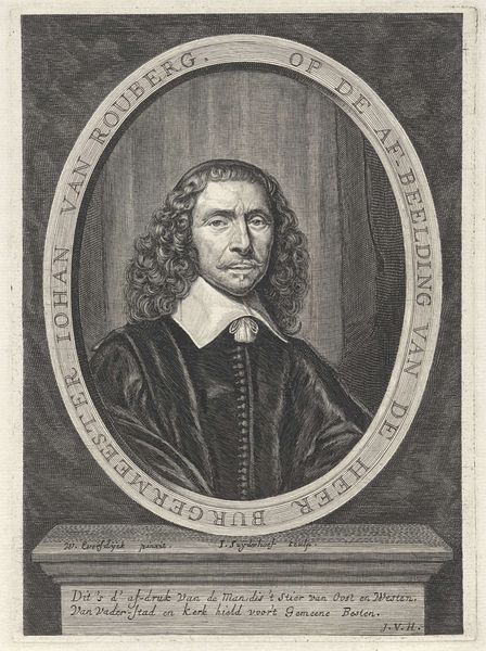 Editor: This is "Portret van Johannes Praetorius" a print by Johann-Baptist Paravicini made sometime between 1656 and 1676. It's interesting; it almost looks like a caricature but there's also a real sense of gravity to the image. What do you see in this piece, Professor? Curator: This print presents Praetorius within a symbolic framework that's quite characteristic of the Baroque era. Look at the hand positioned below the portrait—do you notice anything unusual? Editor: It looks like there are astrological or alchemical symbols in the palm of the hand? Curator: Exactly. The hand serves as an allegorical representation of Praetorius’ character and destiny, drawing upon Renaissance traditions linking the microcosm of the human to the macrocosm of the universe. The portrait, enclosed within a circle inscribed with Greek text, enhances this sense of historical and intellectual continuity. Editor: So it’s more than just a likeness; it’s presenting Praetorius as part of a much grander intellectual and cosmic tradition. The hand, then, acts as a symbolic key to unlocking his essence? Curator: Precisely. The choice of rendering the inscription in Greek suggests the importance of classical wisdom and the era's deep connection with ancient philosophy, shaping Praetorius' intellectual identity. Editor: That connection to history is very prominent in this image. I hadn't considered how much symbolic weight it all carries. Curator: Images such as these aren’t simply records, they're carefully constructed narratives embedding individuals within a rich tapestry of cultural and intellectual memory. They remind us of the enduring human impulse to find meaning in symbols and connect to the knowledge of the past. Editor: I'll definitely look at portraits differently from now on.