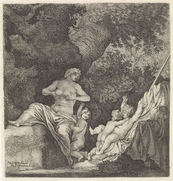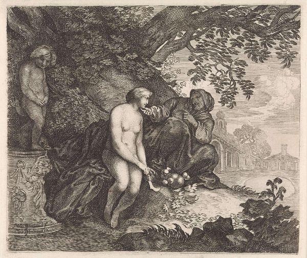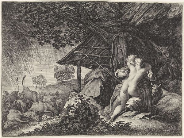 Curator: This is Moyses van Uyttenbroeck's "Pastoral Couple Taking Refuge from a Storm", a small etching housed here at the Harvard Art Museums. Editor: Intimate, but turbulent. The figures huddle together, seemingly seeking solace against an ominous weather pattern. Curator: Indeed. Notice the stark contrasts and delicate cross-hatching which create a dramatic sense of light and shadow. Uyttenbroeck masterfully renders the raw power of nature and the vulnerability of the human form. Editor: Yet, beyond the formal qualities, there is a charged dialogue between nature's unpredictable forces and humankind's precarious position. The storm, in this context, also feels like a symbol of social and political upheaval. Curator: That’s one interpretation, certainly. However, it's important to consider the idealized pastoral tradition in art history, and how Uyttenbroeck is playing with conventions of genre. Editor: Conventions that often sidelined marginalized voices, no? This storm, for me, is also a visual representation of the storms of life, particularly for those historically disenfranchised. Curator: An interesting reading. Editor: Art allows it.