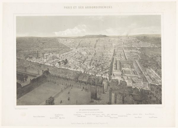 Curator: This delicate rendering shows us the Sixth Arrondissement of Paris. It's from 1850 and is credited to Louis Jules Arnout. Editor: My initial impression is of incredible precision, almost unsettlingly detailed. It's as though every rooftop and street corner is meticulously accounted for, giving it a strangely clinical feel. Curator: The artist must have dedicated immense time and skill to capture the sheer breadth of the cityscape, which also demanded a highly specialized level of artisan printing at that time. Consider the economic conditions for this artwork. I mean, what does it mean to produce it? To consume it? How were these images sold or given away? Editor: From a formal perspective, I find the tonal range fascinating. The restrained palette focuses the eye. There are very few distinct contrasts. Notice how Arnout has established a pictorial syntax with such subtle modulations? It generates an impressive aerial effect. Curator: True, but it also offers a glimpse into 19th-century urban planning, reflecting the rapid changes that defined the city. You have new boulevards and buildings reshaping daily life, alongside the development of print media and visual culture which allowed for easier ways to communicate this process. Editor: Beyond its historical significance, there's also something timeless about it. The geometrical perspective, the way the buildings recede into the hazy horizon—it creates an intriguing composition. It's a masterful construction. Curator: I'm more inclined to focus on what this artwork reveals about labor, industrial advances, the conditions of artistic creation, and the access that Parisians, both then and now, had to view such advancements in print. Editor: An aerial vantage point offers, literally, an elevated position. One of intellectual and perhaps, ideological distance? Interesting to consider it along those lines. Curator: Absolutely, it encapsulates the spirit of an era undergoing constant change. We can spend ages tracing it back to the moment of its creation and initial consumption, can't we? Editor: Precisely. Arnout gives us an opportunity for a concentrated look at Parisian modernity through both artistic strategy and subject.