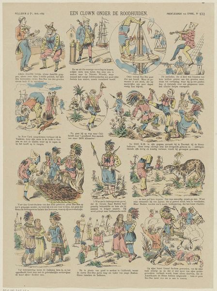 Curator: Here we have a delightful narrative artwork titled "De houthakker en de kabouter," or "The woodcutter and the gnome," created sometime between 1894 and 1959. It is held here at the Rijksmuseum, an intricate scene rendered in watercolor and print. My first observation turns to the composition: the gridded structure immediately gives it an almost comic strip like layout. Art Historian: It certainly feels like a page from a storybook, doesn't it? The sequencing and depiction of folktales like this reflect a growing interest in cultural identity and accessibility. Images like these played a large role in popular education and the dissemination of moral lessons at that time. Curator: Focusing on the figures themselves, I'm drawn to the clear delineations and the color palette – earthy browns offset by the bright reds and yellows. Semiotically, it signals an interesting duality; the woodcutter, depicted in muted tones and the fantastical gnome, are represented by these brilliant hues. The visual hierarchy is evident! Art Historian: I agree. The bright colors and exaggerated poses of the gnome indicate his importance. In terms of cultural context, such imagery normalized the concept of the 'other' - fantastical creatures, or the marginalized populations among us. Art becomes a mechanism for controlling social narratives. Curator: It is precisely in its narrative capacity, with a beginning, middle, and an end, and through formal structuring elements, like the repetition of poses that lend the subject familiarity... the use of perspective creates a depth despite the image existing on an overall flat plane. This imbues the scene with a rich reading. Art Historian: From a historical standpoint, understanding the intended audience helps in interpretation. Broadsides, periodicals, pamphlets using affordable printed art and illustration enabled a mass culture and played roles of influencing political or consumer attitudes during this period. Curator: Examining how form echoes content adds more insights into such considerations. Thank you for providing historical perspective on "De houthakker en de kabouter," and this dialogue has added to my appreciation of the visual rhetoric employed! Art Historian: It’s fascinating how an image created as accessible entertainment holds such complex layers of social and cultural meaning even to this day.