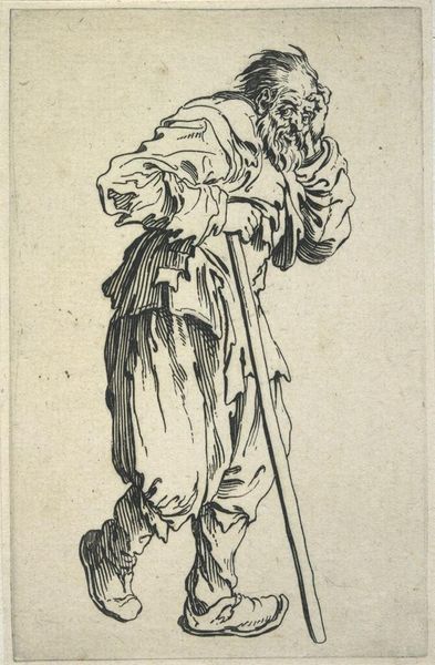Curator: Here we have Adrian Ludwig Richter's "Beggar Leaning on his Stick, after Callot." Editor: It's a rather stark image; the figure seems isolated and worn, doesn't he? Curator: Indeed. Richter is directly referencing Jacques Callot, and it is interesting to consider the role of the beggar as a social trope. What does it mean to depict poverty in this way? Editor: The beggar's posture, his tattered clothing, they speak of marginalization. The lines are expressive, notice how they define his form yet emphasize his fragility. Curator: I agree. Richter’s formal treatment, with its stark contrasts, heightens the pathos, but also risks aestheticizing poverty. Editor: Perhaps. Yet, this piece sparks questions about how society treats its most vulnerable members. Curator: Ultimately, Richter's work offers an exercise in art historical dialogue, echoing Callot's themes across time. Editor: And it challenges us to consider the ethical implications of representing suffering.