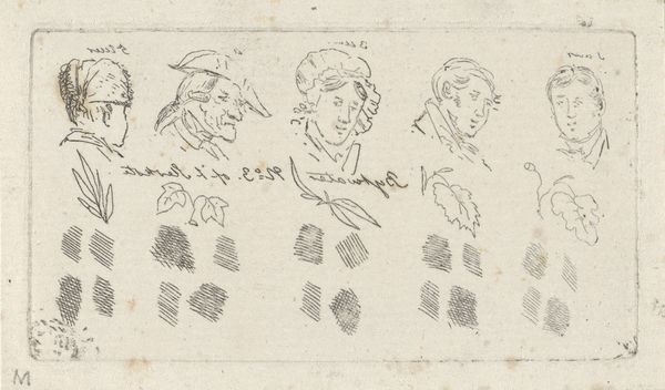 Curator: Let’s consider this study sheet by Anthonie Willem Hendrik Nolthenius de Man, created sometime between 1803 and 1842. It appears to be ink on paper. Editor: My initial impression is that it’s a collection of faces in profile, giving off a very immediate and raw, process-oriented feeling. You get the sense of the artist practicing a skill. Curator: Indeed. If you look closely, the hatching technique suggests a process of layering, of building up the forms. This isn't just a portrait, but also an investigation of light, shadow, and the properties of ink itself. Editor: Absolutely. And each figure is slightly different, maybe even alluding to specific temperaments through posture and hair style. Profiles, since antiquity, carry symbolic power. Here it seems like we are looking at studies of authority or possibly class distinctions in some way. Curator: I would venture that this kind of work reflects academic artistic production. In terms of class, look at the labor implied by the creation of art, even in this simple sketch, compared to the imagined labor of the subjects. This material reality really reframes any perceived power dynamics suggested by profile and so on. Editor: Perhaps the artist intentionally blurred those lines. Note that they seem deliberately detached. Consider that each one is numbered. To me, this calls up something of the way a dramatist or playwright works, imagining distinct roles for actors on a stage, where even simple staging and sketches evoke deeper, symbolic contexts. Curator: Well, by investigating this sketch we are witnessing something. How artists hone their craft has real socioeconomic consequence. Editor: Precisely, it goes both ways! By noting forms, shapes and historical symbols one also notices intention, skill and creative processes that reflect wider culture in very profound ways.