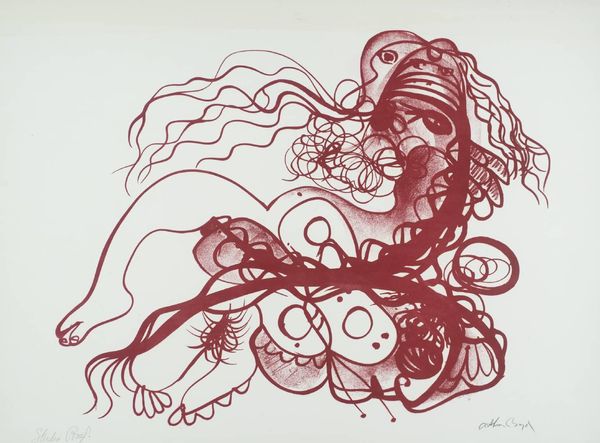 Editor: Here we have Hedda Sterne's "Untitled from Metaphores and Metamorphoses," a 1967 ink drawing. The density of line work is pretty captivating! I am struck by its swirling composition and how the lines create such a dynamic sense of form. What do you see in this piece? Curator: Form is, indeed, paramount here. Consider the interplay of line. Note how Sterne orchestrates the lines' varying weights and densities to construct a fluctuating figure against the negative space of the page. Editor: Yes, I see that! The clustering of lines almost creates shadows, giving the piece depth despite its two-dimensionality. Curator: Precisely! Further observe the movement. The swirling lines direct the viewer's eye around the composition, fostering a sense of continuous, almost cyclical motion. What of the formal relationships between different areas within the drawing itself? Editor: It's interesting that you mention relationships. While there’s an overall feeling of chaos, certain sections have these tight, controlled spirals, contrasting with the looser, more flowing lines in other parts. Curator: A vital observation. This juxtaposition generates visual interest and structural complexity. Consider how Sterne manipulates these elements to sustain visual equilibrium, avoiding a complete descent into either total order or utter disarray. Do you think this piece can speak to a certain balance point? Editor: I think so. I see now that it isn't random; the composition as a whole is tightly constructed and the swirling forms have their place within that. I was focused too much on trying to name what the artwork reminded me of. Curator: It is essential not to subordinate form to external referents. Sterne's work affirms the aesthetic primacy of line and composition. A powerful exercise in controlled spontaneity. Editor: It gives me a fresh perspective and renewed interest in line art. Thanks for unpacking it.