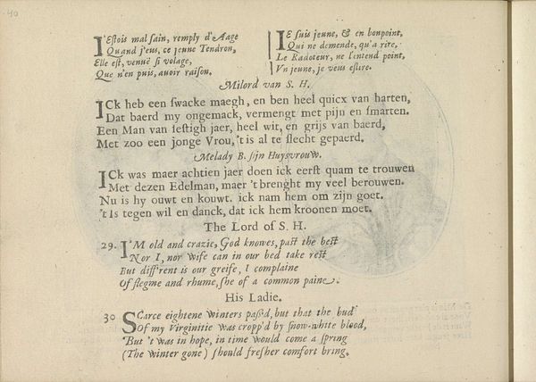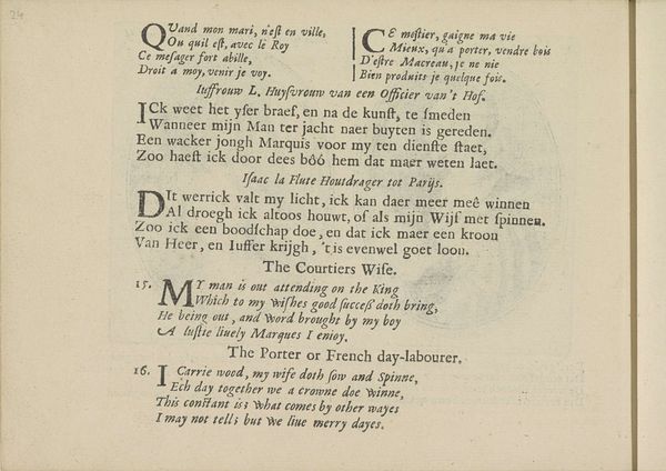 Curator: Today we’re looking at "Kwatrijnen bij de portretten van de courtisanes genaamd Meesteres Magery van Richmond haar dienstmeid Dorothee", an engraving and etching by Crispijn van de Passe the Younger, from 1635, found at the Rijksmuseum. It presents text alongside two portrait medallions. What are your first thoughts? Editor: Immediately, I'm struck by how text-heavy it is. It feels less like a portrait and more like… illustrated poetry? And it’s so orderly, the portraits almost seem secondary to the rigid blocks of verse. Curator: That's perceptive. Indeed, this graphic work functions as both visual art and social commentary. Passe places these women, titled courtesan and chambermaid respectively, within a literary context through these poems or "quatrains" printed beside their portraits. These verses offer glimpses into their lives and social standings. Editor: The verses give the image this really specific context, pinning down how they’re seen. Is it complimentary or critical? There's a line about one being formerly a "Burgers Wijf", a citizen's wife... that sounds pointed. Curator: Exactly. The prints were produced within a specific social and moral climate where perceptions of women, especially those who occupied ambiguous positions in society, were heavily policed. The Dutch Republic was in its Golden Age, enjoying prosperity, yet anxiety existed surrounding social mobility and perceived moral decay. Printmakers circulated images that could either celebrate or critique aspects of the changing world. Editor: It’s so interesting how print could broadcast these opinions, fix them, really. You know, I was trying to imagine their voices, if they’d recognize themselves in this neat little layout. Curator: It’s powerful to think about how prints mediated identities, defining the sitter through carefully worded texts and composed likenesses. The piece sits between art object and socio-political tool. Editor: Right, it’s less about what they looked like, and more about what the culture *thought* they looked like. I wonder what Margery and Dorothee would make of all this today.