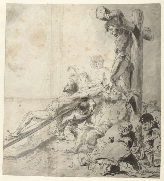 Hans von Aachen made this drawing of Hercules defeating the vices using pen and ink, with a wash of neutral tones to create shadows and depth. The artist has employed traditional techniques of draftsmanship to convey a complex scene. The drawing is made up of sinuous lines, which reveal the artist's hand and the dynamic energy of the composition. Washes of diluted ink add volume and drama, highlighting Hercules' muscular form as he battles the writhing vices. The whiteness of the paper plays a crucial role, creating highlights and emphasizing the contrast between light and shadow. This piece required careful control, and skilled labor; the artist's mastery of the medium is evident in the confident strokes and nuanced shading. The classical subject matter underscores the enduring relevance of artistic traditions. It's a reminder that even in the age of mechanical reproduction, the handmade object retains its unique value.