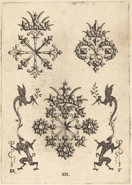Curator: Look at the incredible detail in this engraving! This is “Brooch with Fantasy Animals at Top and Fauns with Vases at Bottom,” created around 1596 by Daniel Mignot. The precision of line is just extraordinary. Editor: It’s certainly striking, if a bit bizarre. Those serpentine dragons at the top seem a bit at odds with the geometric ornament in the center. Almost unsettling, the way the figures frame the symmetrical designs. Curator: Mignot was clearly interested in pushing boundaries, incorporating the fantastical alongside more traditional decorative elements. The contrast highlights the artistry of both forms. Remember this wasn't merely art for art's sake; it was pattern-making that influenced goldsmiths' work. These prints offered tangible designs. Editor: I’m fascinated by the labor involved in crafting such intricate detail through engraving. Imagine the repetitive movements, the intense focus required. The print almost becomes a document of meticulous human effort, a tangible record of the maker’s engagement with material. How were prints like this circulated? Who purchased them and how might they have informed or influenced labor practices more broadly? Curator: The accessibility of prints meant wider dissemination of artistic ideas and, as you say, models for skilled artisans. It allowed a democratization of design previously confined to wealthier circles who would commision goldsmiths. And while the print does feel quite two-dimensional, I can easily imagine that center motif realized as an ornate piece of jewelry, maybe something embellished with gemstones and fine metals. Editor: Indeed. The materiality it depicts evokes that transformation from the page to something precious and worn. We should also think about who wore these brooches—what level of society was permitted or had access to it? Curator: Exactly. Examining it like this makes you think not only about the beauty of it, but about the economics behind that production of beauty, doesn't it? Editor: Yes, considering this intricate design work we see today opens a door to a wider exploration of craft production in the late 16th century. The level of complexity raises compelling questions regarding value and social status.
