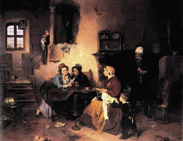 Gerolamo Induno made this preparatory sketch for ''Courtship'' with oil paint. Initially, the earthy tones and subdued light may give the impression of a simple domestic scene. However, the composition reveals a structured contrast. Observe the division of space: to the left, an aged woman sits in shadow, seemingly bound by domestic tools. To the right, a younger woman gazes out the window, bathed in light. The composition thus stages a dialectic between confinement and freedom. Consider how Induno uses the window not merely as a source of light but as a pictorial device that frames the younger woman and invites contemplation on the themes of expectation and transition. The stark contrast in light and shadow also suggests a semiotic system, where light represents hope and the shadowed interior represents tradition. This contrast might subtly question prevailing social values. The rough brushwork and unfinished details further emphasize the transient nature of the moment captured, inviting viewers to reflect on the interplay between tradition and modernity.
