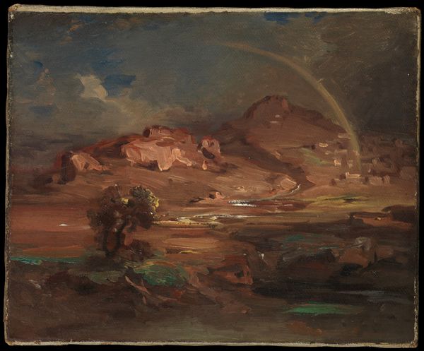 Editor: So, this is Alexandre-Gabriel Decamps' "Passing by on the Other Side," painted in 1839, using oil. I’m struck by the heavy, almost theatrical darkness. It feels so…oppressive. What do you see in this piece? Curator: Oppressive is a good word. But look closer. See that sliver of golden light piercing through the clouds? To me, it whispers of hope amid the shadows. Decamps, bless his romantic heart, loved this dance between light and dark. Editor: Yes, now I see it! But, why this dramatic contrast? Curator: Think about the Romantic era, where landscapes weren’t just pretty pictures. They mirrored the turmoil of the soul. Decamps often infused his works with social commentary, cloaked in exotic settings. Makes you wonder what’s passing by, doesn’t it? What isn't seen or acknowledged. Editor: It does make you wonder! Almost as if, metaphorically, we’re being asked to stop and help. Curator: Precisely! And how often do we choose to simply...pass by? Perhaps Decamps painted it that way to provoke a response, a challenge. Editor: I initially just saw gloom, but now it’s richer. Layers of feeling and meaning that I had missed before. Curator: It reminds me that beauty, and understanding, often hide in plain sight. We just need to take the time to look, to truly see.