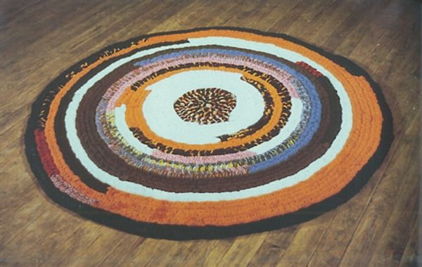 Miriam Schapiro's "Golden Pinwheel" is made using fabric collage, a technique that merges painting with traditionally 'feminine' crafts such as sewing and quilting. Schapiro's work centers around what she called 'femmage' - a term she coined to describe art made by women using domestic materials. 'Golden Pinwheel' is a powerful example of this aesthetic. The work features a dazzling array of colorful fabrics, carefully arranged in a circular pattern that radiates outward. The process of creating this piece involves both meticulous planning and intuitive placement. Each piece of fabric is selected for its color, pattern, and texture, then carefully cut and arranged to create a dynamic sense of movement. Schapiro elevates the status of the overlooked materials and processes, traditionally associated with domesticity, to the realm of fine art. The labor-intensive process is apparent in the intricate details and patterns of the pinwheel. By embracing these materials and techniques, Schapiro challenges traditional hierarchies within the art world, questioning what is considered high art and what is relegated to the realm of craft.