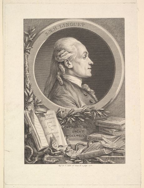 Gottlieb Eckert created this aquatint portrait of Karl Friedrich Ernst Cocceji. Cocceji’s severe profile is framed by a laurel wreath, highlighting the importance of reputation and status in the late 18th century. The inscription "Amicis Amicum," or "a friend to friends," perhaps hints at the social and political networks that bolstered Cocceji's career as a high-ranking Prussian official. Note that the image presents a specific kind of masculinity: rational, composed, and dedicated to public service. It is a vision of leadership that deliberately obscures the personal and emotional life of its subject, presenting a figure of authority rooted in duty and reason. Consider this image in relation to contemporary ideas about governance, friendship, and the performance of identity. In what ways does this formal portrait invite us to reflect on how we construct and perceive authority?
