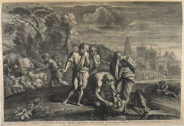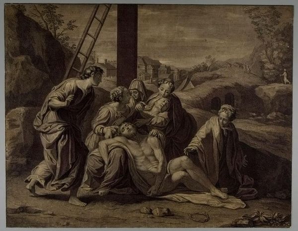 Curator: Looking at this print, "Dead Christ on the Lap of His Mother at the Foot of the Cross" by François de Poilly the Elder, I'm struck by the stark contrast of the pale figures against the detailed landscape. Editor: My first thought is how the artist uses engraving to mimic the textures of fabric, flesh, and earth—making the scene feel surprisingly tactile despite its emotional distance. The layers of labor needed to produce this particular image are of interest, too. Curator: It's true, there is a calculated coldness. The scene itself is deeply tragic, but the precise lines and controlled composition almost sterilize the grief. Almost as if the artist has deliberately created a separation between the viewer and the raw emotion. Editor: Exactly. The material process, the act of transferring this scene onto a copper plate, mediates the emotional impact. The work becomes a commodity as much as a devotional image. Consider the market it was intended for, its role in circulating religious narratives... Curator: Yet, even with that distance, there's a haunting beauty. The delicate rendering of Christ's body, the subtle expressions of sorrow on the faces of the mourners... it speaks to the human capacity for empathy, even when filtered through layers of artistic interpretation and the realities of production. Editor: It does invite reflection on not just faith, but on the very structures that support it. The process, the dissemination—they are all parts of the story.