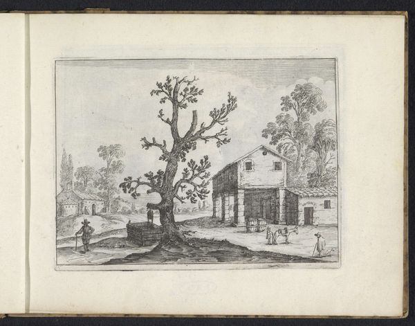 Curator: Looking at "Landschap met een boerderij," or "Landscape with a Farm," an etching dating roughly from 1610 to 1638, crafted by Charles de Hooch, I’m immediately struck by its serene yet melancholic atmosphere. What are your first impressions? Editor: There's an undeniable tranquility evoked by the repetitive strokes defining shapes and the airy composition; however, what grabs me most is its materiality. It's not just the image itself, but the means of production. Etching, unlike other forms of printing, highlights the engraver's mark, emphasizing labor and skill in its production. Curator: Precisely. This piece reveals much about the era’s social dynamics. Consider the subject matter: a rural setting with figures engaged in everyday activities, suggestive of labor. Editor: And it subtly hints at consumption; this etching would likely have been reproduced and distributed widely. I wonder about the social context surrounding this image, who its intended audience was and what relationship the patron and printer had. Was this print a standalone piece, part of a collection or a book? The details surrounding production affect how we view and understand the landscape portrayed here. Curator: I find the arrangement, the interplay between light and shadow so sophisticated. Hooch organizes depth employing intricate sets of line, generating form in dark accents like those in the vegetation framing the building on the right, directing the eye inward. Note the building itself, it feels so constructed, a set of perpendicular forms oriented to allow entry on more than one level, and that lovely elevated walkway—a touch of formal invention. Editor: It reminds me of vernacular architecture; but let’s dig deeper into the labor aspect here: Hooch wasn't simply capturing a scene but employing skills passed down through generations. Where did he learn his craft? And what other kinds of images did this print compete with? Was this kind of landscape design in competition with traditional oil paintings? What type of printing press did Hooch and the printer work on? I think all of these questions invite us to understand the art beyond purely formal grounds. Curator: A fruitful line of inquiry, to be sure. This landscape allows us to dwell in these imagined moments and ponder Hooch's command over line and form and how deeply connected they are to the human world depicted in this piece. Editor: Ultimately, studying "Landscape with a Farm," opens up discussions about artistic choices but equally engages with how prints can serve not only aesthetic roles but economic, social, and intellectual ones within a complex society.
