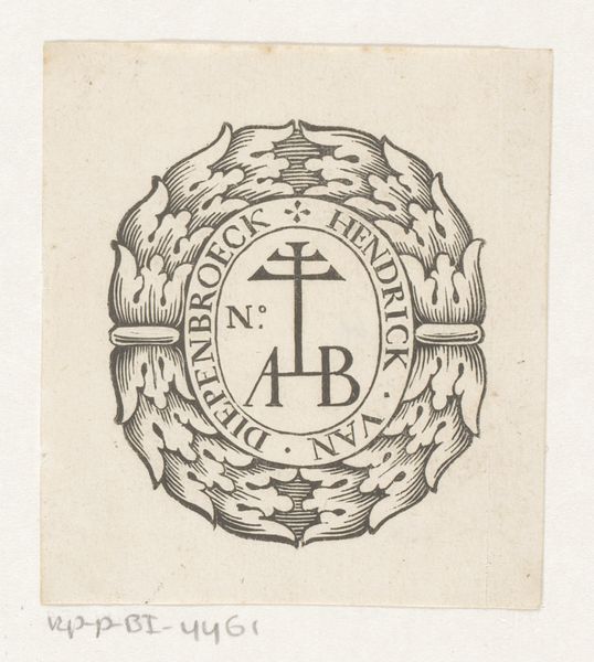 Editor: So, this is a 17th-century engraving called "Vignet van Dirck Boortens te Haarlem." It's a geometric print and looks to me like it might have been used as a kind of emblem or a bookplate. I’m struck by how compact it is and, with all the detail crammed in, the whole thing just *buzzes*. What do you make of it? Curator: Buzzes, you say? That's lovely! I find myself wandering in its tiny world, imagining the Haarlem of Dirck Boortens. What stories did this bookseller's mark silently witness? The precision of the engraving pulls you in. Do you notice the lettering intertwined within the laurel wreath, and then again in the shield on top? I see a mind playing with symbolism, not just communicating facts, but almost planting a puzzle. Editor: A puzzle… yes! I hadn’t considered that it might be more than just decorative. The initials D.B. inside the oval… Were these kind of marks common? Curator: Absolutely. Think of it as a brand identity long before corporate logos. This vignette announces, "This is Boortens’ work, and Haarlem is its origin." A claim of craftsmanship, pride and location all rolled into a tiny seal. It speaks of belonging, wouldn’t you say? Of a craftsman firmly planted in their world? Editor: Definitely. And thinking about it as a ‘brand’ shifts my perspective completely. It’s no longer just decoration, but a declaration. So much meaning packed into such a small space. Curator: Exactly! It’s a reminder that art can be subtle, intimate, yet deeply rooted in its time. That little buzz we both felt wasn't just artistic, it was a historical whisper!