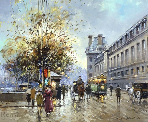 Curator: The artwork before us captures a slice of Parisian life. It’s titled "Porte St. Denis" and is attributed to Antoine Blanchard. Immediately, I’m struck by the luminescence that permeates the scene despite the grey palette. Editor: There's a distinct atmosphere, isn't there? A hazy, wet quality… it evokes the sensory experience of a city street. You can almost feel the dampness radiating off the canvas. Look at the reflections. Curator: Note how Blanchard uses distinct, broken brushstrokes, an application technique that enhances the city's vibrancy and evokes light interacting with water on the pavements. This technique certainly plays with the concepts of impressionism and optical mixing. Editor: The cobblestones look slick and realistically treacherous. What sort of pigments do you think Blanchard was favoring for these wet textures? Was he experimenting with new mediums to achieve that almost slick-like feeling? The physical production itself seems paramount here. Curator: Observe how the artist arranges figures. Note the clear delineation of space – buildings providing the backdrop and framing, people traversing the foreground, all constructing this pictorial field. It's masterfully balanced. Editor: Beyond compositional mastery, there’s also that interplay between man and machine in the age of industrialisation. The trams, the horse-drawn carriages... This is a Parisian snapshot of a society wrestling with evolving methods of transit. What kind of work went into crafting this cityscape? The buildings hint at the immense amounts of labor that would have been needed for the quarries and trades that came together. Curator: Indeed, these motifs point towards progress while the hazy ambience reminds us of time. Each constituent brings depth to its symbolism. It feels rich and immersive. Editor: A study in textures, social histories, and industrial change rendered beautifully with tactile presence on this canvas. Curator: An artistic convergence between feeling and form and a perfect note on which to conclude our time here. Editor: Precisely, a reminder of the labor of rendering city life both pictorially and historically.