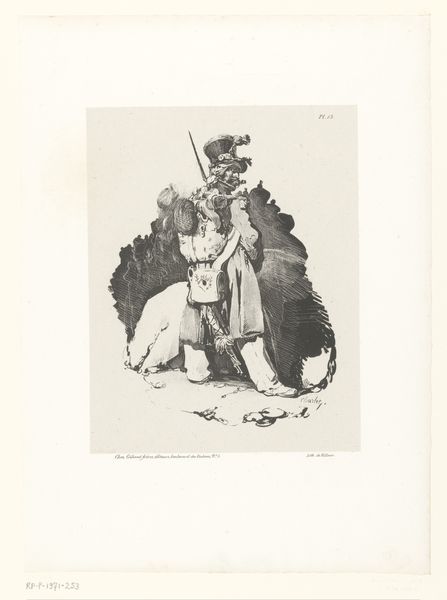 This drawing, "Acteurs in theaterkostuum met een snuifdoos" by Carle Vernet, presents us with two figures rendered in delicate lines, set against a suggestive backdrop. The composition is striking. Vernet positions one figure in a lion costume and the other in classical Roman attire, creating a juxtaposition that is both theatrical and thought-provoking. The line work, particularly in the costumes, is intricate, inviting us to examine the textures and forms closely. The drawing destabilizes conventional representations by blending different cultural and historical codes. Are we witnessing a commentary on the performative nature of identity? The act of sharing a snuffbox suggests intimacy and equality, cutting across the artifice of their costumes. Vernet uses the visual language of theatre to explore broader social and philosophical themes, reminding us that art is not a fixed entity but a dynamic site of inquiry and interpretation.