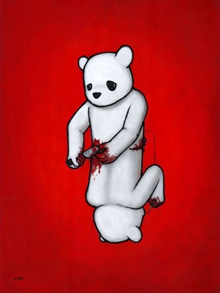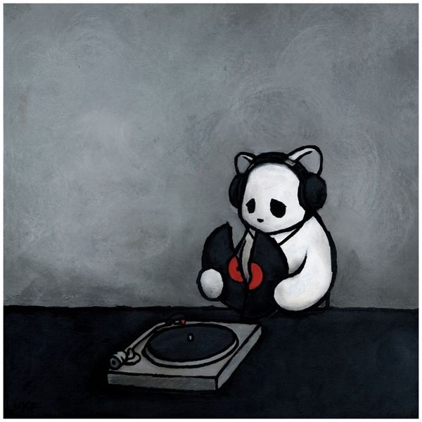 Curator: Here we have Luke Chueh's "Gero-Hero (Bat-Bear)" from 2006. It appears to be executed in oil. What strikes you about it? Editor: He looks utterly defeated! That droopy little mouth, those giant, questioning eyes...it’s like Batman after a really, really bad day. Or maybe every day. Curator: Well, Chueh’s work often explores themes of existential angst and the darker sides of human emotion. He is known for using deceptively cute characters. The layering of "hero" and "bear" taps into contemporary superhero fatigue in pop culture, even poking at society’s disillusionment with idealized figures. Editor: I dig that! The bear's like, "I signed up for heroism, not…this." And the simple background kinda traps him. Is he a hero, or is he just playing dress up in the attic on a rainy afternoon? I mean, those uneven eye holes don't scream crime fighter, more arts-and-crafts project. Curator: It does emphasize the construction of identity. How much is genuine versus performed? Is he Bat-Bear, or just a bear playing at being Batman, in an almost melancholic space? And consider Chueh's consistent palette—usually muted tones, furthering the downbeat mood. Editor: Exactly. I keep wanting to give him a hug! It’s interesting, too, how Chueh plays with the caricature here. He emphasizes the sadness, the helplessness, almost weaponizing cute. Curator: That resonates with art history and social commentary in interesting ways. Caricature often serves as a powerful tool to subvert authority and lay bare underlying truths, however uncomfortable. Editor: True. It’s way more emotionally complex than just a superhero parody. It actually reminds me of the dark humour found in early Simpsons episodes. Not LOL funny but human-level funny… in a “laugh so you don’t cry” kind of way. Curator: So we're looking at more than a simple mashup—the artist evokes larger concerns regarding the modern world, communicated via very approachable character. Editor: Absolutely. Beneath the surface, there's that deeper "oh no, what’s it all for?" Curator: It gives us something substantial to consider about image construction and emotional narratives. Editor: Leaving us questioning our own costumes too.