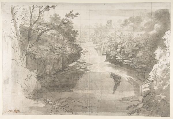 Editor: So, this is "Landscape with Waterfall," a lithograph drawing on paper by Pendleton's Lithography, date unknown, from the Art Institute of Chicago. It gives me this immediate sense of the sublime, of humanity confronted by powerful natural forces. What strikes you when you look at this piece? Curator: That's a great starting point. For me, I see a romanticized vision of nature that was popular, particularly among the white male elite, who could afford to travel and contemplate these "wild" landscapes. But whose land are we really looking at here? And who is profiting from the romanticization of this landscape? Editor: That's something I hadn't considered. You mean, how the image might gloss over issues of land ownership or exploitation? Curator: Exactly. Look at the figures positioned within the landscape – what are they doing? How do they relate to the industry also represented? Are they spectators or active participants? How does the rendering of the landscape serve to legitimize certain activities and erase others? It also speaks to a certain gendered gaze. Who gets to "discover" and possess this landscape through representation? Editor: That’s a totally different reading than my first impression. I was initially thinking of nature's grandeur, but you’ve reframed it as a space imbued with social and political meaning. Curator: These landscapes were not empty spaces. Indigenous communities were often displaced to create these picturesque views, and their stories are notably absent. The romantic ideals mask potentially brutal realities. Art reflects and shapes social realities. Editor: I'm starting to see the piece in a whole new light. I realize my initial reading was a bit…naive. Thanks! Curator: That is the point of critical art viewing: continuous learning and unlearning! It makes you question not just the art, but your place within the historical narrative.