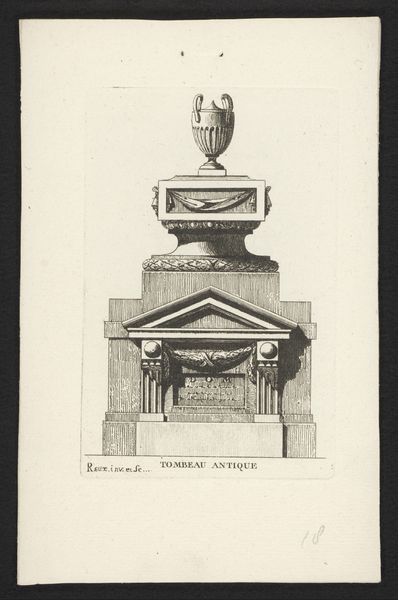 Editor: Here we have J.F. Clemens' engraving from 1783-84, a depiction of "L. Holbergs sarkofag i Sorø kirke"—that's Holberg's sarcophagus in Sorø Church. It feels very…stately, I suppose, in its neoclassical way, with all its symmetry. What catches your eye in this piece? Curator: You know, it's interesting you use the word "stately." It absolutely aims for that effect. I think the precision of the engraving, the clear lines, work so well with the subject – it speaks to Holberg’s rationalism, his commitment to enlightenment ideals, doesn't it? It almost makes me think of a perfectly organized mind, every thought in its place. Then you have those figures flanking the inscription, hinting at… I don't know... Holberg's intellectual pursuits? What do you make of them? Editor: Well, they seem classical, referencing Holberg’s influences maybe? Like allegories? Are they standard iconography of the period, these figures? Curator: Exactly! They borrow heavily from classical imagery, which was very trendy at the time. It was a conscious choice to associate Holberg, this intellectual giant, with the wisdom and virtue of antiquity. See how Wiedewelt, the actual sculptor of the sarcophagus, tried to fashion himself as a 'restorer of liberal taste,’ just as the inscription says, in a kind of Roman way? The whole scene echoes, right down to the clean lines of a Roman coin? That’s why the work is timeless to a point; neoclassicism and engraving tend to age like marble. And maybe that was precisely the intended goal! Editor: So, it's about making a statement, not just commemorating Holberg? Curator: Precisely! It is more about crafting Holberg's lasting legacy by linking him to these concepts – maybe that's the most enlightening idea about it. Editor: I hadn’t thought about it that way – that neoclassical style was deployed with real intent. It gives the piece much more depth for me now.