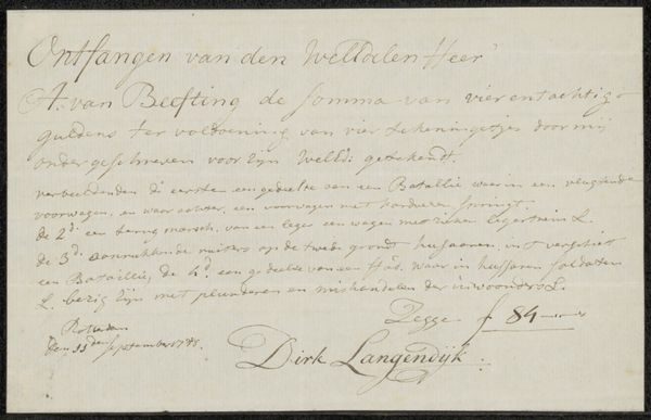 Curator: Looking at this artwork, I can’t help but feel like I’ve stumbled upon a secret message, a whisper from the past. It’s entitled "Kwitantie voor Aernout van Beeftingh" – a receipt, made between 1790 and 1796, by Dirk Langendijk. Editor: Immediately, I'm drawn to the ink on paper. The texture almost jumps out – you can see how the fibers of the paper have interacted with the ink, which creates a very handmade feeling. Curator: Absolutely. Imagine the quill gliding across the page, the scratching sound as each word came into being. The act of writing itself becomes performative. But receipts are quite everyday things, and in that light the beautiful flowing lines of the cursive font adds a peculiar feeling to something so mundane. I wonder if it's meant to elevate the document. Editor: It is definitely an object imbued with a strange sense of authority because, without this precise arrangement of language and materiality, the debt wouldn't be valid. Think of the social relationships involved! Someone had to labor for this receipt to even exist. The price of the paper, the preparation of the ink... Curator: I hadn't considered all that labor. It transforms the piece. But I’m curious, too, about Aernout van Beeftingh himself. What was he buying? And from whom? This little paper contains the shadow of lives intertwined. Editor: Perhaps Van Beeftingh was Langendijk’s patron. A look at some of Langendijk's prints reveals a pattern of commissioned artworks of military or naval incidents. The material support must have shaped Langendijk’s production quite considerably. Curator: Interesting! It goes to show how deeply connected artists were with their surrounding circumstances, as much now as back then. It encourages us to think about this as more than just a receipt, but a sort of historical residue of artistic exchange, material exchange and maybe even social exchange. Editor: Right, every little line, the precise handwriting... It all contributes to a historical and artistic document that reflects on materiality and its impact on people and artworks.