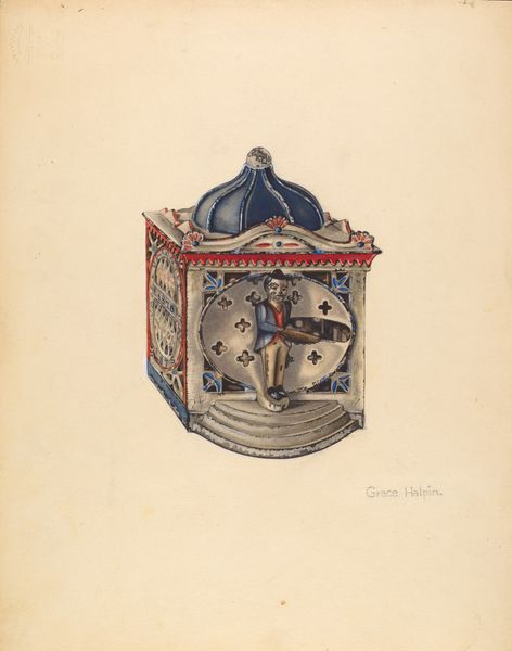 Editor: Here we have William O. Fletcher's "Toy Bank: Frog," created around 1938 using pencil and watercolor. The artwork renders a frog perched on top of what appears to be a decorative bank. I find the object quaint, but a bit strange. How do you interpret this work? Curator: The date is key; this work surfaces during the Great Depression. The charming presentation is deceptive. I look at this piece through the lens of accessibility, specifically economic disparity. Ask yourself: who is saving, who can afford to save, and what is the social status of people portrayed as animals? Editor: That's interesting! So you're suggesting the "toy bank" might represent a tension between financial stability and the struggles of the time? Could the frog be a symbol of something too? Curator: Exactly! Frogs are often associated with transformation. Are we looking at the potential for change, a desire for upward mobility that's literally 'banked' upon, or a critique of a system that keeps certain demographics stuck? Notice the elaborate lattice on the bank, almost cage-like; what barriers might that represent? Consider too the perspective: we are looking *up* at this frog. Who benefits from this viewpoint? Editor: I never would have considered the perspective or the cage! Thinking about it that way makes it seem less like a charming drawing and more of a social commentary. Curator: Precisely. It's a reminder that even seemingly simple artworks can be loaded with socio-political implications. It provokes discussions on power, social status, and the visualization of economic possibility during periods of upheaval. Editor: That has completely shifted how I see this piece. Thanks for expanding my perspective beyond the surface. Curator: My pleasure. It’s essential to remember art doesn't exist in a vacuum; it reflects and shapes our understanding of society.