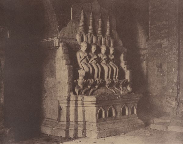 This photograph, by Otto Hisgen, captures images of Buddha and two princes in the Mendoet Temple, south of Magelang, in the Dutch East Indies. It’s a grayscale image, and immediately, I’m drawn to how Hisgen navigates light and shadow, a dance that reveals form but also conceals it. The texture of the brickwork and the smoothed surfaces of the statues create a compelling contrast, emphasizing the material essence of the space. I see the careful gradation of tone around the central Buddha, a lighter halo set against the darker stone behind it. It’s not just about documentation; it’s about creating a mood. Looking at how light bleeds into the darker corners, I can’t help but think of Eugène Atget, another photographer who documented the world around him with an eye for the poetic. There’s a conversation happening here, across time and media, about how we see, how we remember, and how we create meaning from the world around us.