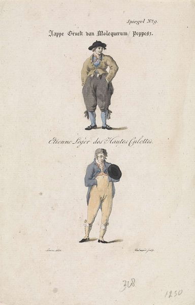 Curator: So, here we have an etching from 1814, its title being “Spotprent op de Hollanders (nr. 4), 1795 / 1814”, which translates to “Cartoon of the Hollanders, no. 4”. Editor: Gosh, those are… distinct figures! It’s as though they’re plucked right out of a dream, or perhaps a slightly acidic nightmare. There's a nervous energy—uncomfortable but intriguing. Curator: They do make a striking impression! Caricatures, particularly of this period, rely heavily on symbolism to convey political or social commentary. The artist here seems to focus on exaggerating features for humorous or perhaps critical effect. What stands out for you symbolically? Editor: Oh, the postures, absolutely. The first fellow, back turned, clutching his purse—almost turtle-like—suggests a closed-off, maybe even miserly attitude. The middle chap, shouting with open arms… either aggressive or ridiculously welcoming. And then there’s the languid gent slumped in the chair; indifference or exhaustion, perhaps? Curator: Exactly! Notice how the inscription underlines this effect. The captions beneath the figures read: "Face your enemy," "Advance with courage," and "Watch with care". This contrast creates a certain irony. The etching appears to mock the Dutch through the words, but more powerfully through the burlesque style. Editor: It's also funny how this scene echoes old comedy traditions where certain characters are meant to be mocked. The style kind of hides the more profound reflection on these old rivalries or social tensions through its satirical and comic features, it's truly interesting. Curator: Right, the seemingly innocuous image, with its clean lines, becomes a vehicle for some powerful commentary. The work is really quite amazing. Editor: Indeed, and revisiting it, I notice how we bring our own cultural and personal context, and those three figures speak volumes.