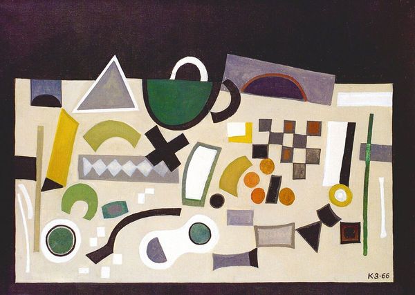Curator: What catches your eye about this painting? Editor: It has a curious tension. The textured surface gives it a sort of naive, almost folk-arty feel, while the geometry screams of a modernist sensibility. It's compelling. Curator: Precisely! This is Paul Klee's "Oriental Garden," painted in 1939. Note the patchwork of forms—houses, vegetation—all rendered as simple geometric shapes, and all under this rather enigmatic dark blue "sky". What can these abstracted forms and simple building blocks be expressing? Editor: For me, it speaks of constructed environments, like the prefabrication of landscapes under industrial production—the mechanization of nature reduced to raw components for reassembly. The title seems almost ironic. Is this orientalism viewed through the lens of the industrial revolution? Curator: Possibly. The shapes, though abstract, are imbued with associative power. Notice the almost hieroglyphic quality to some, evoking ancient architectural renderings alongside something more playful, modern. I find a beautiful nostalgia woven through these simplified shapes, reflecting perhaps on lost worlds. Editor: Yes, but how much does the medium dictate the message? Klee’s use of oil, usually associated with high art, and the visibly laboured application; those cross-hatched lines…they almost undermine any attempt at classical notions of "the Orient." This speaks to a very modern way of deconstructing and re-presenting established symbols. Curator: A potent tension, certainly. Klee masterfully employs color and form to evoke layered historical narratives, inviting reflection on the relationship between humanity and its cultivated spaces. He captures an imaginative idea of 'Orientalism,' less about a literal place and more about its memory. Editor: Absolutely, and maybe the materials chosen—oil on canvas versus say, watercolor—reinforce the way Klee seeks to build, deconstruct and preserve that idea itself as a cultural artefact. Food for thought!