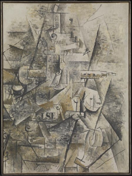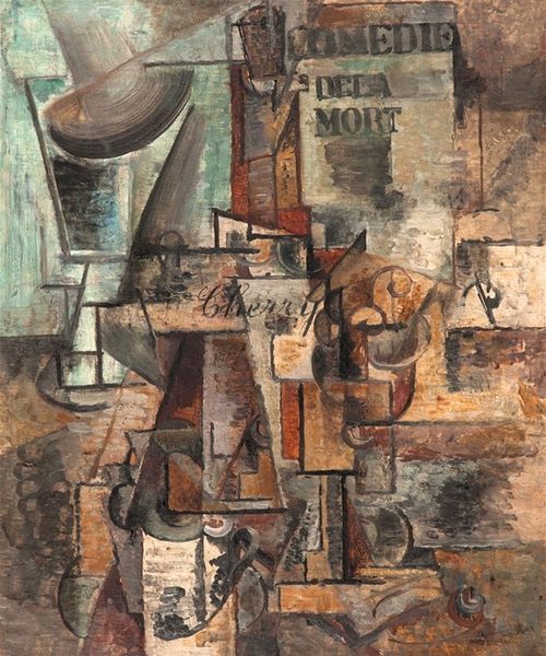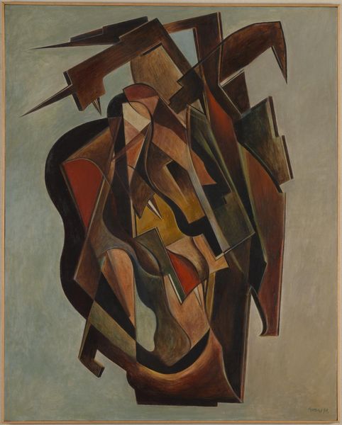 Editor: We’re looking at Emil Filla’s “Woman with a Fan,” painted in 1917 using oil. The palette is rather muted, almost somber. What stands out to me is how the human form seems fragmented and reassembled. What symbols do you see embedded here? Curator: The fan, first and foremost. Consider its historical use: a tool of flirtation, yes, but also of controlled expression in rigid social structures. Notice how it partially obscures the figure, hinting at secrets, a hidden narrative. In Cubist works, everyday objects often acted as allegories of modernity and the fracturing of perception. Does that resonate with you? Editor: Yes, I see that now. The geometric shapes also suggest a sense of unease, maybe reflecting the turbulence of the time period? Curator: Exactly! Think about 1917. The First World War was raging. Filla, deeply affected, channeled this anxiety through disrupted forms. The fragmented woman could be a metaphor for a society shattered by conflict. Even the subdued colours speak to loss, perhaps mourning. What feelings do the colors evoke in you? Editor: A sense of restraint, almost repression. It makes me wonder what aspects of the figure's personality the artist wanted to emphasize. Or suppress. Curator: And what of the objects? Do the carafe and fruit represent domesticity, disrupted and recast, reflecting the anxieties of wartime existence when so many things had fallen out of orbit and felt… unhomelike? Filla reinterprets the still-life by putting into it tension, but in so doing perhaps reveals an unintended feeling of being unstuck. Editor: So, beyond just a portrait, it’s a coded commentary on societal anxieties and a struggle with cultural shifts. It's amazing how a seemingly simple image can hold so much history. Curator: Indeed. Every fractured plane, every carefully chosen object, builds to a powerful visual statement on identity and societal upheaval.