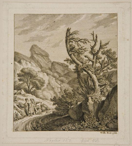 Editor: This print, "Hermit" by Johann Georg Wille, draws me right in. It feels…almost theatrical, a stage set for some untold story. What leaps out at you when you look at it? Curator: It whispers tales of solitude and connection, doesn't it? See how the figures huddle together, dwarfed by the looming rocks, yet a humble dwelling indicates safety. Do you think the landscape is a reflection of the inner world? Editor: Possibly! The tree, barren but reaching, suggests resilience despite hardship. Is that too on the nose? Curator: Not at all! Perhaps Wille is inviting us to find beauty, even wisdom, in life's quieter corners. A reminder to seek refuge in nature and within ourselves. It’s a gentle invitation to pause. Editor: I love how a simple scene holds such depth. It shows how much stories an artist can fit in a small piece!