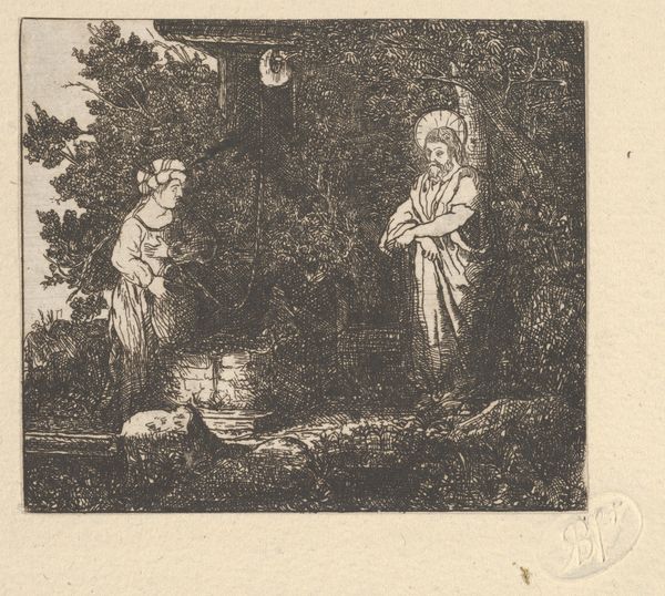 This is Stefano della Bella's "Diana, from 'Game of Mythology,'" a delicate etching, rendered with precise lines that belie the dense forest scene. The goddess Diana is central; she is presented with a striking contrast of light and shadow achieved through fine, hatched lines. The composition is structured around a dynamic interplay between foreground and background. Notice how the detailed foliage and the figures of Diana and her dogs are sharply defined, drawing our eye to the narrative unfolding in the immediate space. The backdrop, sketched with a lighter touch, suggests depth and distance. Bella's formal choices evoke a sense of both intimacy and grandeur. The meticulous detail invites close inspection, revealing the artist's mastery of the etching technique, while the expansive landscape situates the goddess within a vast mythological domain. Ultimately, the print engages us in a dialogue between control and freedom, stillness and motion.