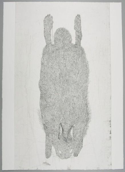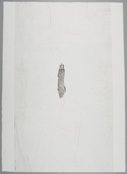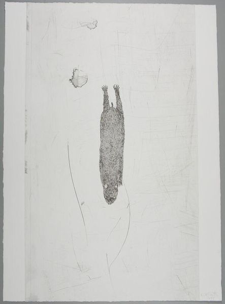 Curator: Here we have Kiki Smith's etching, "6 of 7 etchings in Portfolio: White Mammals," housed here at Harvard. Editor: My first thought? It's hauntingly beautiful. The stark white and gray, that single, suspended form—it feels both vulnerable and powerful. Curator: The composition is strikingly minimal, isn't it? Smith isolates the figure, emphasizing its texture and form. Note how she uses the etching technique to create a nuanced surface. Editor: It's like she's stripped away everything but the raw essence of the animal, its animality. I wonder what sort of commentary she might be making about humanity through this lens. Curator: The very title "White Mammals" suggests a broader exploration of shared biological traits, the animal within us all. The print becomes an exercise in reduction, essentializing mammalian form. Editor: It's unsettling but also invites empathy. I keep thinking about what it means to see something stripped bare like this. Curator: Indeed, and it's this very tension, between stark observation and emotive response, that makes Smith's work so compelling. Editor: It’s a powerful piece that lingers. I will not easily forget this ghostly portrait.