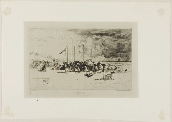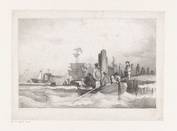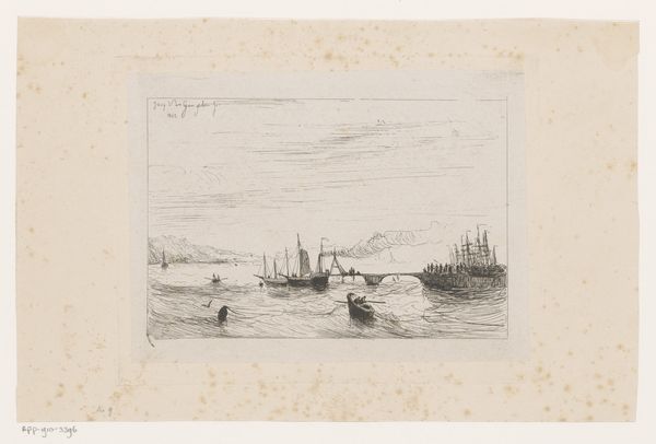 Editor: Here we have "Landscape with Skaters on the Ice around a Mill," an etching by Jacques Van Gingelen, dating back to 1842. It has this quiet, almost dreamlike quality about it. What do you see in this piece, looking beyond its calm exterior? Curator: I see a commentary on community and the human relationship with the environment, but also potential anxieties about industrial encroachment. While ostensibly a picturesque scene of leisure, think about what a frozen landscape represents – a temporary suspension of natural order, a moment of shared risk and opportunity. The windmill, then, looms not just as a feature of the landscape, but as a symbol of changing economies, perhaps even threatening the very community it serves. How does the artist position the human figures in relation to the dominating architecture of the windmill? Are they dwarfed or empowered? Editor: That's a compelling take. I initially saw it as just a simple genre scene, but your perspective makes me think about the power dynamics. The people do seem smaller, more vulnerable. Is this commentary about industrialization unique to this artist or time period? Curator: The anxieties were brewing across Europe, as agriculture and trade evolved. Artists like Van Gingelen found themselves at a crossroads, reflecting both the charm of the familiar and the unease of the future. It's worth thinking about whose perspective we see in these idyllic scenes. Does it romanticize rural life or critique the changes happening? And whose voices are missing from this picture? Editor: I never would have considered that without your input! I learned to really dig deeper and contextualize my understanding. Curator: Exactly, it’s about seeing the threads that connect art to larger social and political conversations.
