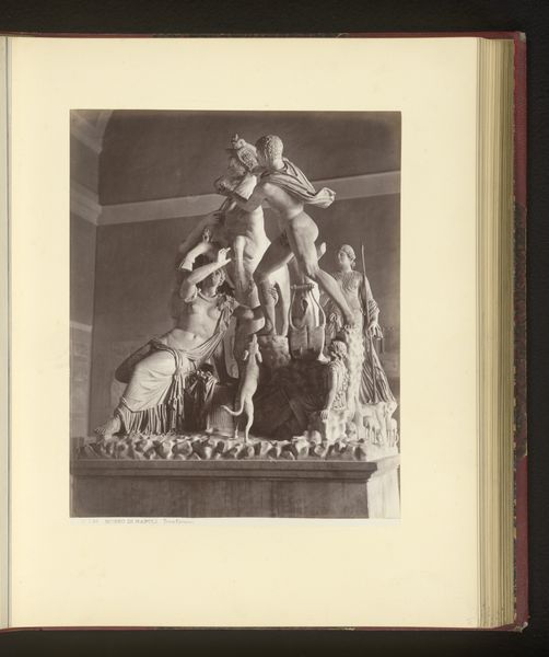 Curator: At first glance, this photographic print appears to capture utter chaos, figures sprawled in desperate entanglement. What's your read? Editor: You’re right, there is an immediate sense of dramatic intensity! The high contrast, the almost theatrical lighting, really amplify the drama of it all. Curator: Precisely. What we’re looking at is a photograph titled "Beeldhouwwerk Toro Farnese in een museum van Napels," which translates to the Farnese Bull Sculpture in a Naples museum, dating to around 1880-1920. Editor: The photograph documents an iconic Roman sculpture. The Farnese Bull. One of antiquity’s largest and most elaborate sculptural groups, right? How fascinating that photography allowed wider access to these massive artworks displayed inside museum collections! Curator: Indeed. Notice how the photographer stages the scene. They play with the sharp shadows that enhance the sculptural form. It almost creates another layer of meaning to this work of art as it preserves how individuals interacted with these ancient narratives. Look at the emotional content. We can speculate that they all fall within a unified symbolic event. What can you tell me about this? Editor: It is quite common for such mythological subject matter in that period, tapping into powerful ancient mythologies and linking to larger political themes like triumph and tragedy, the price and the weight of leadership... We understand from the literature that it has been seen as both violent conquest and a moment of pity when Dirce was tied to a bull. I'm drawn to this ambiguity! Curator: Agreed, the ambiguity is vital. This photographic reproduction provides both access to the imagery, but also offers insight into cultural perceptions and social themes popular at the time of its creation. Editor: Absolutely. The ability of photography to disseminate and reimagine classical art is so telling, pointing toward new cultural relationships, too. Curator: So this photograph becomes a symbolic cultural artefact itself, echoing past traditions and engaging present anxieties, what a complex dialogue with history and modernity! Editor: Agreed. What seemed like visual drama opens into such a complex intersection of social meaning and the enduring power of the sculptural image.