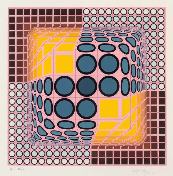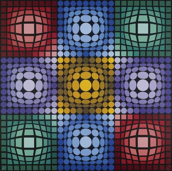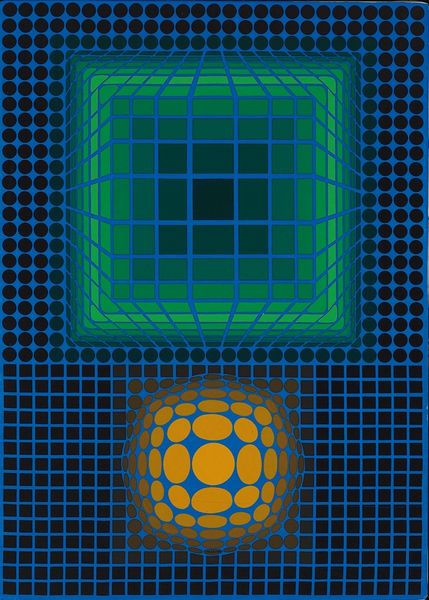 Victor Vasarely made 'Paris-Tokyo #4' with paint, constructing an image that pulses and recedes. It's all about color and the optical illusion, but I find myself looking at how the circles touch, don’t touch, how the colors next to each other make different effects. The surface is super smooth, which is part of the point, right? It's not about the hand of the artist, it's about the effect on your eye. Look at how the circles in the middle of each plane are stretched, creating this sense of depth, and how the colors shift to enhance the illusion. The way he’s organized the individual parts is so precise. This kind of visual trickery reminds me a little bit of Bridget Riley, but with a hard edge. Ultimately, it makes you think about how much our perception is constructed, rather than simply received.