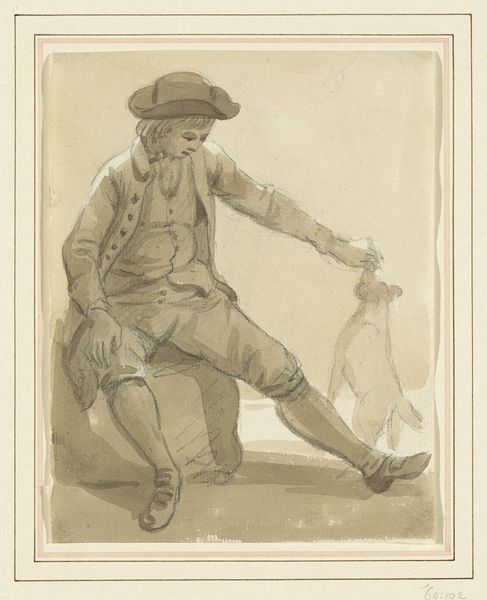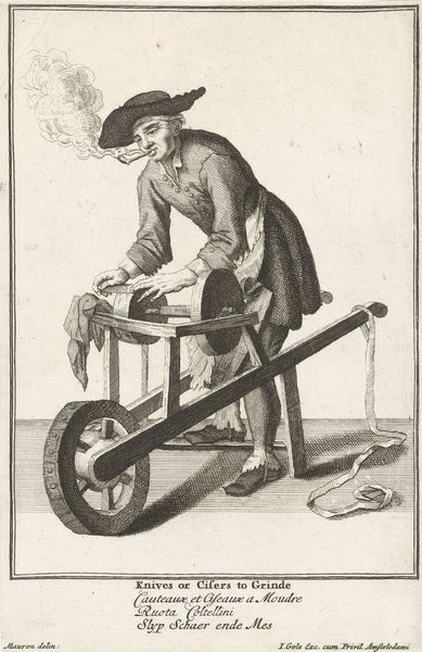 Editor: So, here we have "Man sitting on the edge of a wheelbarrow" by Mathias de Sallieth. It's an engraving, probably from the late 18th or early 19th century. It’s interesting; the figure looks kind of worn down, but also oddly dignified. How do you interpret this work? Curator: I see a powerful commentary on labor and social class. The man's posture – the way he's slumped on the wheelbarrow, his clothing, and even the inclusion of the pipe – speak volumes about his position in society. Consider the context: who were the working class during this period, and what was their lived experience? Editor: Right, so it's not just a simple portrait of a worker. Curator: Precisely. De Sallieth likely aimed to do more than just represent the man. This could be a statement about the social order. Note the detail of the jug and cup. Were they meant to humanize or mock the character, or reveal a level of material life? Editor: That’s a great point. I hadn't considered the details of the setting so closely. So, how does his portrayal relate to broader artistic trends of the time? Curator: The rise of realism and genre painting reflected a growing interest in everyday life, but artists like De Sallieth could also use these genres to subtly critique social inequalities. Think about how this image might have been viewed by different audiences, particularly those who occupied very different positions within society. Editor: I guess, looking at it now, I can see that it could be a very radical statement for its time. It forces you to confront questions of labor and social injustice. Curator: Exactly! And that confrontation, that disruption of the status quo through art, remains powerfully relevant today. Editor: Thanks, this has given me so much more to consider. It's made me realize how important context is when looking at a seemingly simple image. Curator: And how art can serve as a critical lens to understand the power dynamics that shape our world.