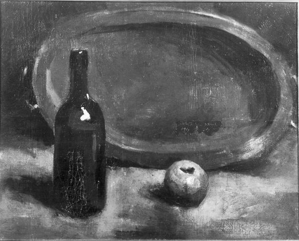Editor: This is Samuel Peploe's "Still Life with a Bottle," an oil painting. I'm struck by how he’s simplified everything – the forms are geometric and the brushstrokes so visible. It almost feels unfinished. What do you see in this piece? Curator: It's precisely that tension between representation and abstraction that captivates. The objects themselves – the bottle, the glass, the fruit – they’re age-old symbols of hospitality, conviviality, even abundance. But Peploe reduces them to their essence, their symbolic weight almost palpable. Consider how the stark white background amplifies this tension. It pushes forward like a void, and it brings the shadowy depth behind these forms forward as well. Editor: So, it’s not just a pretty arrangement; it’s a commentary? Curator: Oh, certainly. The Expressionist style here points to the emotional power that can reside within the ordinary. A bottle is just a bottle. But in the hands of a painter, it is transformed into a powerful statement about modern life and feeling. Does this reading clarify Peploe's aesthetic commitment? Editor: It does. It's about seeing the deeper story embedded in familiar shapes and colors, which, honestly, I hadn't picked up on. Curator: These artists ask us to think about not just *what* is depicted but *how*, and *why* these particular forms carry emotional and cultural meanings. Peploe challenges us to slow down, and reflect on all the meanings held within this intimate setting. Editor: Thanks, I appreciate the insights into Peploe's symbols!