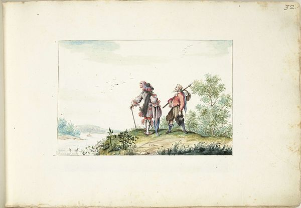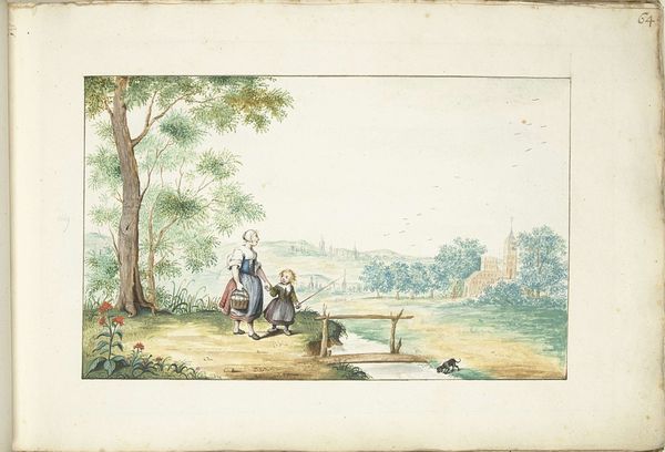 Curator: This lovely watercolor is titled "Three Young Children in a Landscape" and it's by Elchanon Verveer. The Rijksmuseum dates it somewhere between 1836 and 1900. What strikes you immediately about it? Editor: Melancholy, almost sepia-toned. And the technique... that layered wash effect speaks of control, yet there's a beautiful fragility to the overall impression. You can almost smell the damp earth. It certainly leans heavily into the Romantic spirit. Curator: Yes, that atmospheric perspective is classic Romanticism. The hazy distance and emphasis on feeling over precise detail. And it’s watercolor, which gives it a transient, ethereal quality. But beyond that aesthetic, I keep thinking about labor. Editor: You're focusing on the work *behind* the image? Curator: Absolutely. Watercolors of this period often mask the immense skill needed to achieve the subtle gradients and luminosity we see here. There's a lot of labor implied. Beyond that, consider the children themselves. Their clothing and bare feet tell a story of working class life. They're participating in rural economies, however young. And the inclusion of the goat? Another symbol of a working, productive landscape. Editor: That goat is pretty darn cute though. I like that the composition places these three figures, plus the goat, right on the edge of this landscape with all those looming clouds, almost like a stage. A simple narrative, made captivating with light. And the way the girl is posed seems carefully designed to draw our eyes to her companions and the animal she's attending to. Curator: But designed for what purpose? We're looking at, potentially, a work commissioned to project a specific idea about rural life. A vision shaped by those consuming the image, not necessarily reflecting the realities experienced by these children and their families. Was it a detached commentary by a societal member removed from their reality, romanticizing labor through aesthetic skill? I wonder if the intended viewing public truly understood the lives represented or simply reveled in this picturesque scene. Editor: A fascinating point to consider when looking at Verveer's approach to portraying landscapes. You’ve certainly changed the way I see this seemingly simple watercolor. Curator: And I find that looking at how a work of art has been fabricated offers a completely different perspective on this seemingly straightforward piece. It also changes how I see labor practices from back then to now.