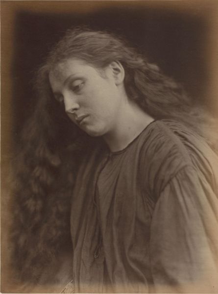 Curator: Julia Margaret Cameron’s 1865 gelatin silver print, "Sappho," now housed at The Metropolitan Museum of Art, strikes me immediately. What is your first impression? Editor: A dreamy wistfulness. The soft focus almost dissolves the subject. It evokes a very romanticized vision of the past, doesn't it? Curator: Indeed. The romantic lens is, perhaps, unavoidable here. Cameron's pictorialist style deliberately rejects sharp realism for a more subjective and atmospheric approach. Note how the light delicately catches the planes of her face and neck. Editor: But look closer. That heavy necklace of repeated oval shapes… isn't that almost primitive? What cultural meanings did that convey, placed upon a figure titled "Sappho?” Curator: Certainly, Sappho, the ancient Greek poet, carries a powerful legacy as an emblem of female love and artistic expression. This is undoubtedly what Cameron intended. Her attire, juxtaposed against the soft light, seems intended to emphasize the romantic view that associated sapphic women with a bohemian lifestyle. Editor: Yes! It feels almost performative. Consider how Sappho, as a historical figure, has been constantly reimagined. By styling her model this way, Cameron contributes to the myth, even crafting a new visual vocabulary of it. Curator: Precisely. The symbolism embedded here is so potent and multi-layered. I appreciate how the very texture of the print reinforces the historical weight. Editor: And yet, through Cameron’s photographic technique, the iconic and real somehow merge. It's fascinating how the material – the necklace, the gown – adds a new level to the historical dialogue we still have today. Curator: Agreed, this seemingly simple portrait really does unpack quite beautifully. Editor: I think it encourages a wonderful dialogue around how history and image intertwine.