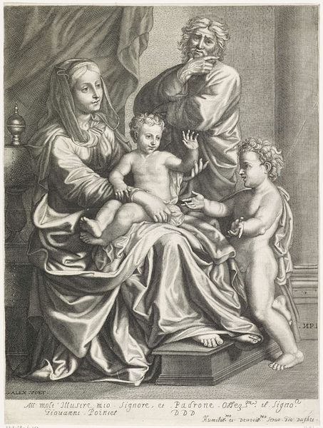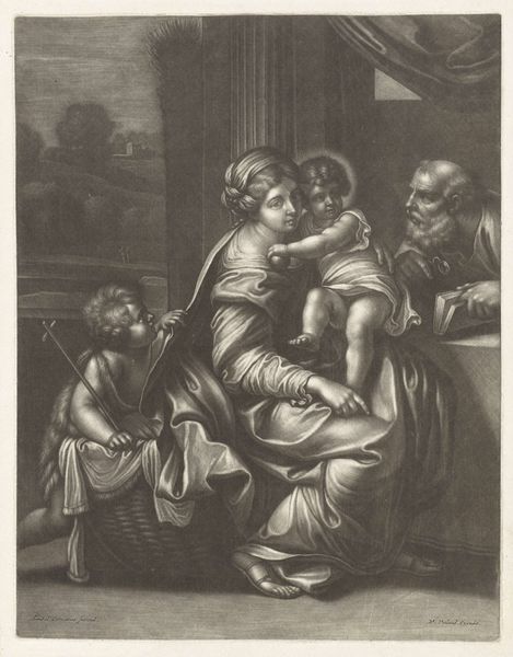Editor: Here we have Francesco Bartolozzi’s "Madonna with the Fish," residing at the Harvard Art Museums. The scene feels both intimate and formal. What symbols do you find most compelling in this piece? Curator: The fish offered by the child carries profound symbolic weight. In early Christian iconography, the fish, or "ichthys," served as an acrostic for "Jesus Christ, Son of God, Savior." Editor: So, the fish isn't just a fish! Curator: Exactly. It's a visual reminder of Christ's identity and mission, encoded within a seemingly simple object. The book held by the saint would allude to knowledge or faith, while the angel suggests divine presence. Editor: I’ll remember to look beyond the surface details from now on. Curator: Indeed, symbols unlock layers of meaning within art, connecting us to the past and influencing our perception.