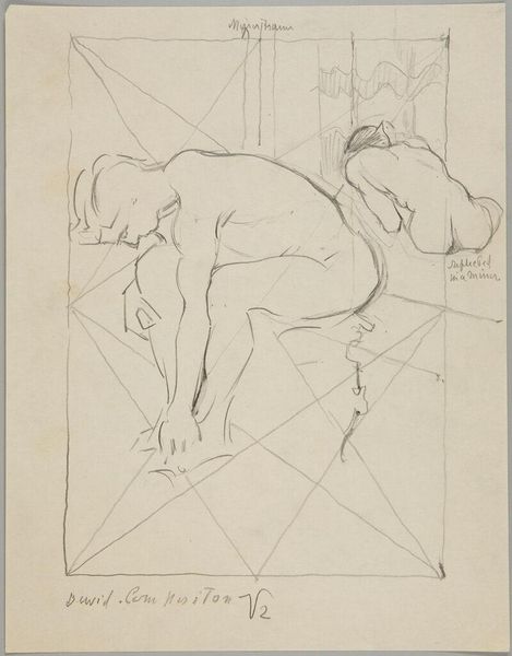 Editor: So, here we have Denman Waldo Ross's "Male Nude with Head Resting on his Arm," a pencil drawing. I'm intrigued by the underlying geometric framework, but it also feels very vulnerable. How do you interpret the symbolism here? Curator: The geometric underlay is fascinating. It suggests a search for ideal form, echoing classical traditions. Do you notice how the figure seems contained, almost trapped, within those precise lines? It evokes a tension between freedom and constraint, perhaps a reflection on the human condition itself. Editor: That makes me think about the contrast between the rigidity of the grid and the fluidity of the human form. Curator: Precisely. That contrast highlights the symbolic weight we often place on the body, and the internal struggles with societal expectations or even self-imposed limitations. Editor: It’s definitely given me a new perspective on how artists use symbolism to convey complex emotions. Curator: And that exploration of visual symbols, across time and cultures, that's where art truly resonates.
