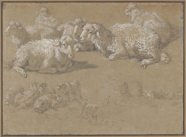 Giovanni Domenico Tiepolo created this drawing, Cattle in a Landscape, using pen and brown ink with brown wash over graphite. The composition is dominated by the arrangement of cattle in various states of repose and activity, set against a lightly sketched landscape. The limited palette of browns and creams evokes a pastoral scene, tranquil yet somewhat desolate. Tiepolo masterfully employs line and wash to define the forms of the animals, capturing their weight and texture with minimal strokes. Notice how the contrast between the detailed foreground figures and the more ambiguous background elements creates a sense of depth. The landscape isn't just a backdrop; it plays an integral role in framing and contextualizing the figures. The arrangement of the cattle isn't random; they lead your eye across the scene. This calculated use of space and form reflects Tiepolo’s engagement with the artistic conventions of his time, while subtly subverting traditional landscape painting. It reminds us that art continually evolves, challenging our established ways of seeing.