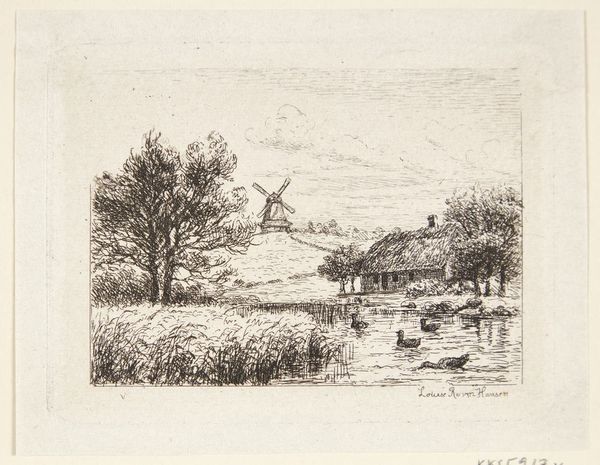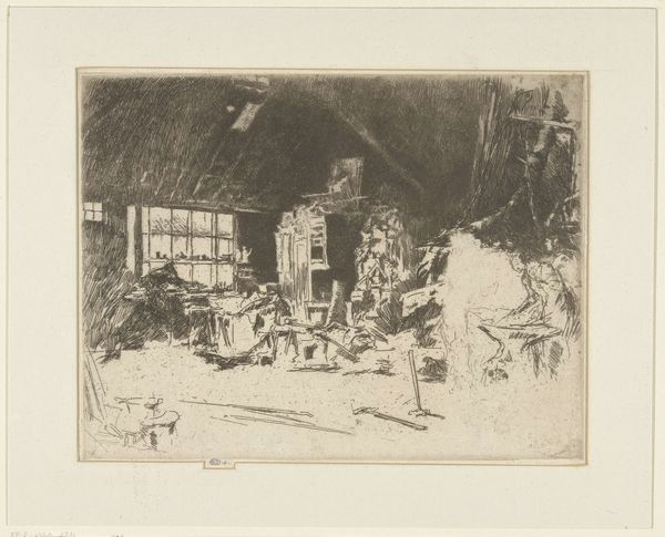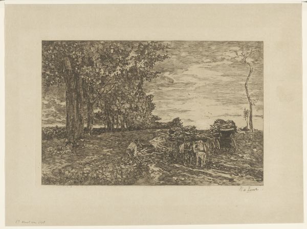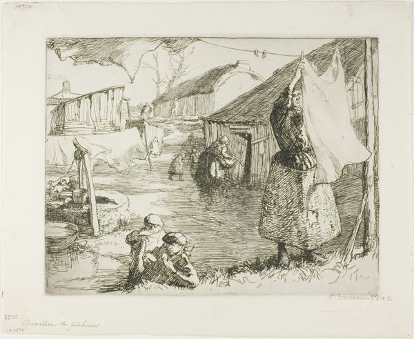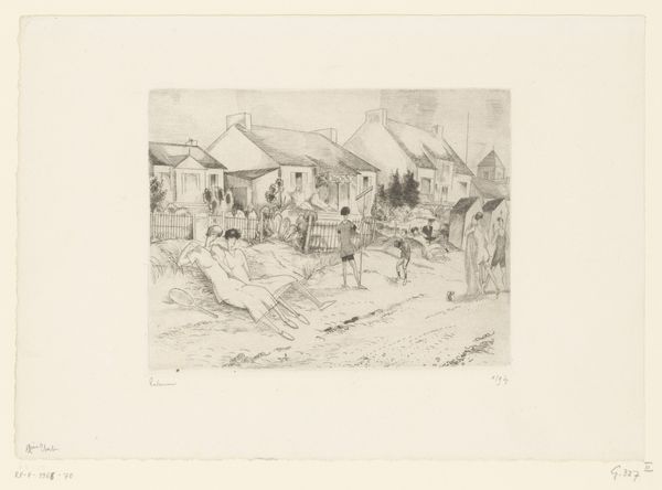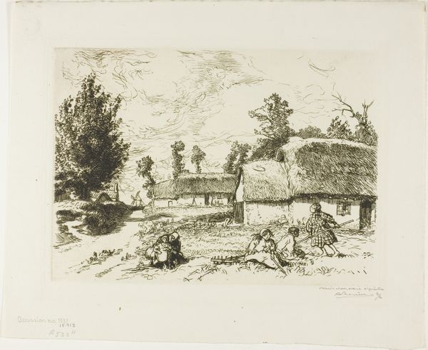 Auguste-Louis Lepère created the etching "The Nest" on paper, using finely etched lines to construct a cozy rural scene. The composition divides into distinct zones: a foreground with children nestled amongst vegetation, a middle ground featuring rustic buildings, and a distant background that fades into the horizon. The artist uses the etching technique to create a visual texture that invites closer inspection. Notice how Lepère employs line and shading to build depth and dimension. The thatched roofs and foliage are rich in detail. The dense arrangement of lines creates darker tones, drawing our eye to the central structures and the group of figures in the foreground. Lepère's work embraces an aesthetic that challenges the clear boundaries between the natural and built environments. The scene captures the charm and simplicity of countryside existence. The delicate balance between form and function, structure and setting, evokes a sense of nostalgia. The artwork encourages us to interpret the relationship between human life and the natural world.