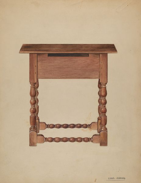 Editor: So, this is "Duncan Phyfe Sewing Cabinet," a drawing dated circa 1939 by Mattie P. Goodman, rendered in watercolor and colored pencil on paper. The formality of the piece, its symmetrical, almost architectural structure, really strikes me. What do you see when you look at it? Curator: My attention is drawn to the interplay between the linear and curved elements. Consider the vertical reeding of the cabinet against its overall elliptical form. It creates a visual tension, wouldn’t you agree? The eye moves along these surfaces in anticipation of closure, of some resolution between straight and curved. Editor: I do see that. And the choice of warm browns throughout. Does that limit the way we experience the object? Curator: Not at all. Restraint in color can intensify our focus on form. Goodman carefully modulates the tonal values, giving volume to what could be a very flat presentation. Notice how light plays across the top surface, articulating the subtle convexity. Ask yourself what that does for our apprehension of it. Editor: It definitely makes it feel more real, less diagrammatic. Like an object that exists in space, rather than just a representation. So, is the tension between line and curve the essence of this work? Curator: Perhaps not the "essence," but it is certainly a key structural component that directs our gaze. We could explore other aspects - the interplay between texture and plane. It is complex, no? Editor: Absolutely. I initially saw just a drawing of a cabinet, but now I see layers of careful choices in form and light. Thanks! Curator: Indeed, these layers and choices constitute the artist’s approach and, subsequently, the viewer’s. It reveals the rigor behind the drawing and the construction of artistic understanding.