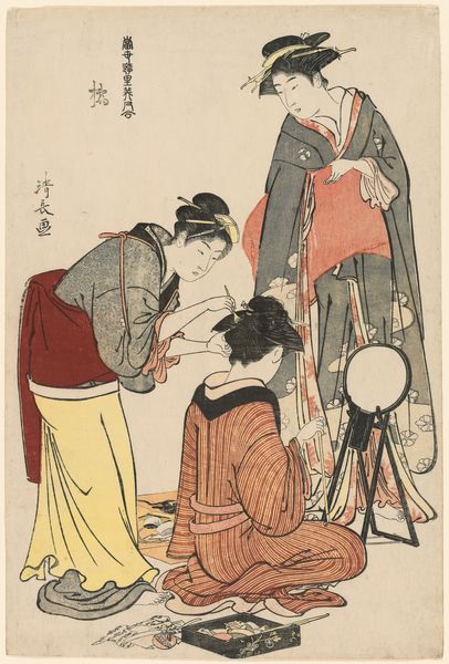 Editor: This print, "A Young Nobleman, His Mother, and Three Servants, from the series "A Brocade of Eastern Manners", by Torii Kiyonaga, dates back to around 1783 or 1784. The way everyone is looking off in their own direction gives me a really curious, almost secretive feeling. What stands out to you most in this Ukiyo-e print? Curator: The arrangement of figures in a single line, that's a deliberate compositional choice which brings a specific visual cadence! They're processional, aren't they? Leading our eye along, yet each holds a distinct, almost private world within their gaze. Imagine yourself stepping into their shoes – silk slippers, of course. What story would you tell from within that brocade of Eastern manners? What scents do you catch on the breeze, what unspoken words hang in the air? Editor: That's so evocative. I hadn't really thought about it that way, as if I was *there.* So, it’s less about a snapshot, more about an atmosphere? Curator: Exactly! Kiyonaga’s prints weren't simply documenting; they were creating a mood, a sense of sophisticated leisure and a touch of poignant mystery. They invite us to not just look, but to linger and invent. Tell me, does it remind you of any stage dramas, any dreams you've once dreamt of, or perhaps a fragment of a tale you might craft into existence? Editor: It almost feels like a story waiting to be written. Thanks! Curator: A mutual learning, truly! I feel enlightened by considering your perception. The invitation to perceive what doesn’t immediately meet the eye – now *that*’s the magic.