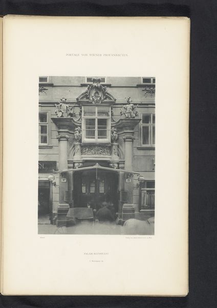 Curator: Before us, we have a print from before 1894, titled "Toegangsportaal van Stadtpalais Liechtenstein te Wenen," depicting the entrance portal of the Liechtenstein City Palace in Vienna. It is labeled as anonymous. Editor: Ah, there’s something both grand and haunting about this image. All those architectural details, like, fossilized in grayscale. It almost feels like a stage set for a gothic play. Curator: I think the print, done using photography, beautifully captures the Neoclassical architecture, specifically emphasizing the relationship between the facade, its sculpted details, and the urban environment it occupies. The emphasis is decidedly on capturing the physical presence of this grand civic structure, no? Editor: Absolutely. And yet, to my eye, it’s more than mere documentation. Notice how the light catches those statues flanking the entrance. They seem burdened, almost reluctant, as if holding up more than just stone. I wonder what narratives the palace walls could tell if they could talk. It brings the surrounding architecture and material into a conversation with a silent history. Curator: Precisely. Consider the consumption implicit within Neoclassical art movements. The act of production is itself reliant upon particular labor economies as a means to facilitate the building and subsequent representations of the physical spaces being produced. The image serves as an invitation to explore social meanings constructed within the context of architectural production, then, through these buildings being the objects of art themselves. Editor: True, true. And it gives me a feeling that these formidable buildings had an inner world too. I catch a strange whiff of melancholy despite the rigid stone; maybe the architect’s dream, ossified into matter? Curator: I think we are touching on the legacy and the transmission of cultural capital within the print itself, how these imposing structures served to convey power and project dynastic aspirations which continue to subtly impact culture via mediums such as this photographic reproduction. Editor: Ultimately, for me, this image of the Stadtpalais’s entrance portal speaks to a timeless allure – architecture and the cityspace. A memory of grand architecture captured in monochrome light. Curator: And for me, it leaves lingering questions about who built it, how, and whose stories remain untold within the shadows of its imposing facade.