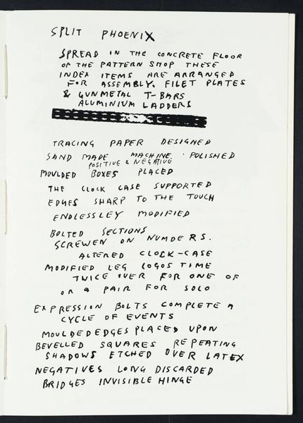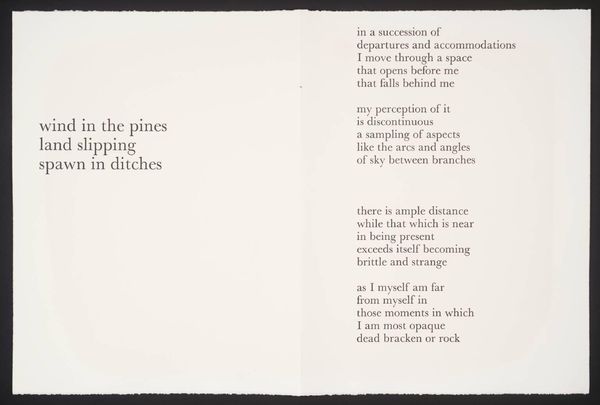 Editor: This untitled piece by Ian McKeever features text printed on a broad sheet. The arrangement of the text strikes me as quite fragmented and sparse, almost like a constellation. What do you see in its composition? Curator: The interplay between the textual elements and the negative space is indeed compelling. Consider the deliberate placement of the words. How does this calculated arrangement contribute to the work's overall impact? Editor: I think it creates a sense of isolation, but also invites the viewer to pause and consider each phrase independently before relating it to the others. What is the purpose of that? Curator: Precisely. It is through this careful orchestration of form and content that McKeever constructs meaning, prompting us to delve into the structural relationship between language and visual representation itself. I learned about new perspectives in this artwork. Editor: Me too!