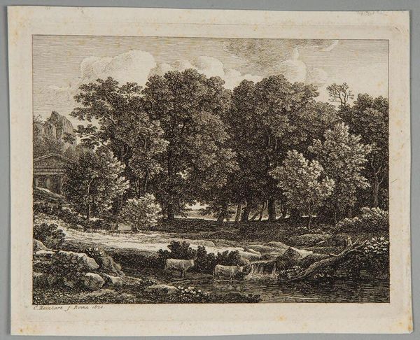 Editor: Here we have Ferdinand Kobell's "Road Leading Out of the Woods," an etching. It feels like a snapshot of everyday rural life, but also carefully composed. What's your take on the social context of this scene? Curator: Well, consider the period. Landscapes like this gained popularity as symbols of national identity and pride. How does this idealized view of rural life potentially gloss over the realities of peasant life and labor? Editor: That's a good point. It almost romanticizes it, doesn't it? It makes me wonder about who this art was really for. Curator: Exactly! Were these images intended for a burgeoning middle class eager to connect with the land, or were they meant to legitimize existing power structures? Editor: I never thought about landscape art having so much social and political baggage! Curator: These works are always speaking to the socio-political climate, we just have to listen.