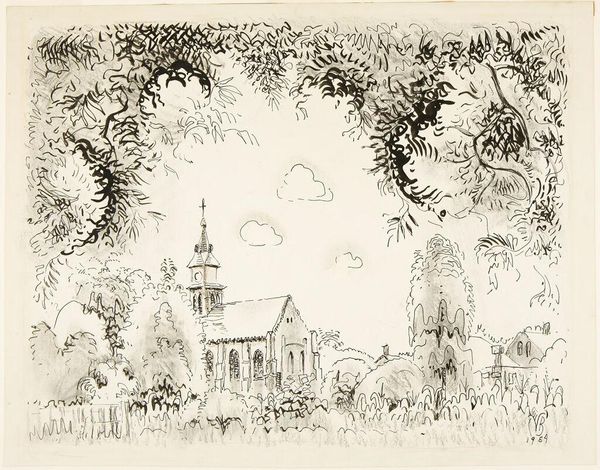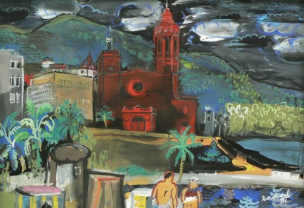 Curator: John Piper’s "Blenheim Gates" is a visual treat, isn’t it? Those gateposts emerge like playful sentinels from a thicket of painterly foliage. Editor: Yes, initially the composition feels quite theatrical; the vibrant red of the gateposts contrasts sharply with the surrounding verdant and almost menacing greens. Curator: I feel it's the color that first grabs you, that dance between the warm structures and cool nature. Piper’s work often treads the line between abstraction and representation. He’s not just painting a gate; he's capturing a mood. Editor: Precisely. The rough, almost gestural application of paint obscures the precise architectural details, shifting our focus from literal representation to the emotional resonance of place. It's about feeling, rather than seeing. Curator: It's like the gates are guardians of a secret garden, and Piper is letting us peek through a crack in the wall. It’s a glimpse. Editor: Indeed, and perhaps that glimpse is more potent than a full view. The painting becomes an experience, a fragment of memory. Curator: Exactly! Art is always a mystery. Editor: It's a puzzle.