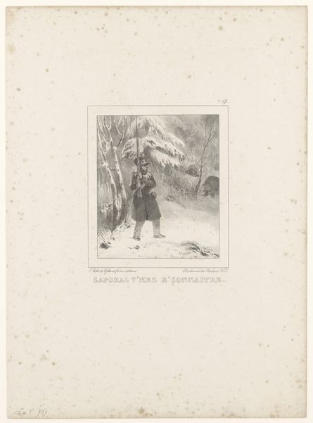 This print, “Soldaat op de uitkijk in de sneeuw,” was created by Nicolas Toussaint Charlet. Charlet lived through the tumult of post-revolutionary France and was a grenadier in the National Guard. The print portrays a solitary soldier, rendered small against a stark, snowy landscape, his posture suggesting both vigilance and weariness. The image is rich with the historical and social context of its time, reflecting on themes of duty, sacrifice, and the human cost of conflict. How might we consider the emotional toll of war on the individual, especially within the framework of early 19th-century French society? What does it mean for a man to stand guard in the cold? Is the artist glorifying or criticizing the concept of war? The artist is asking us to consider the raw, unglamorous realities faced by ordinary soldiers, inviting us to reflect on the profound impact of historical events on personal experience.